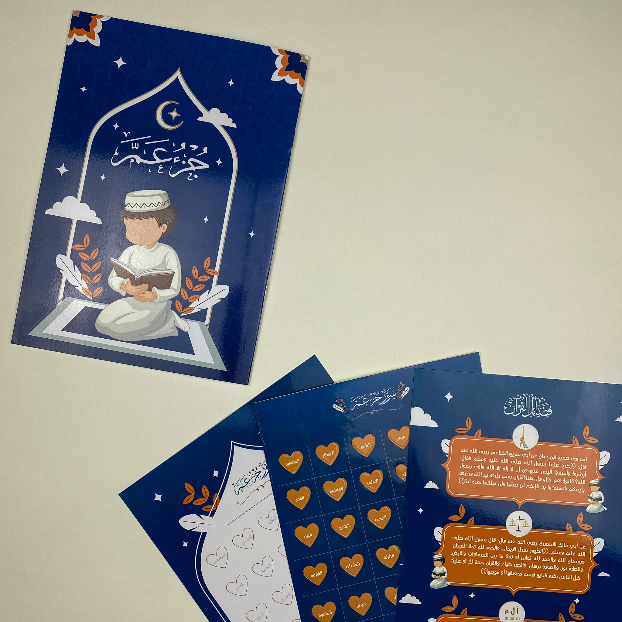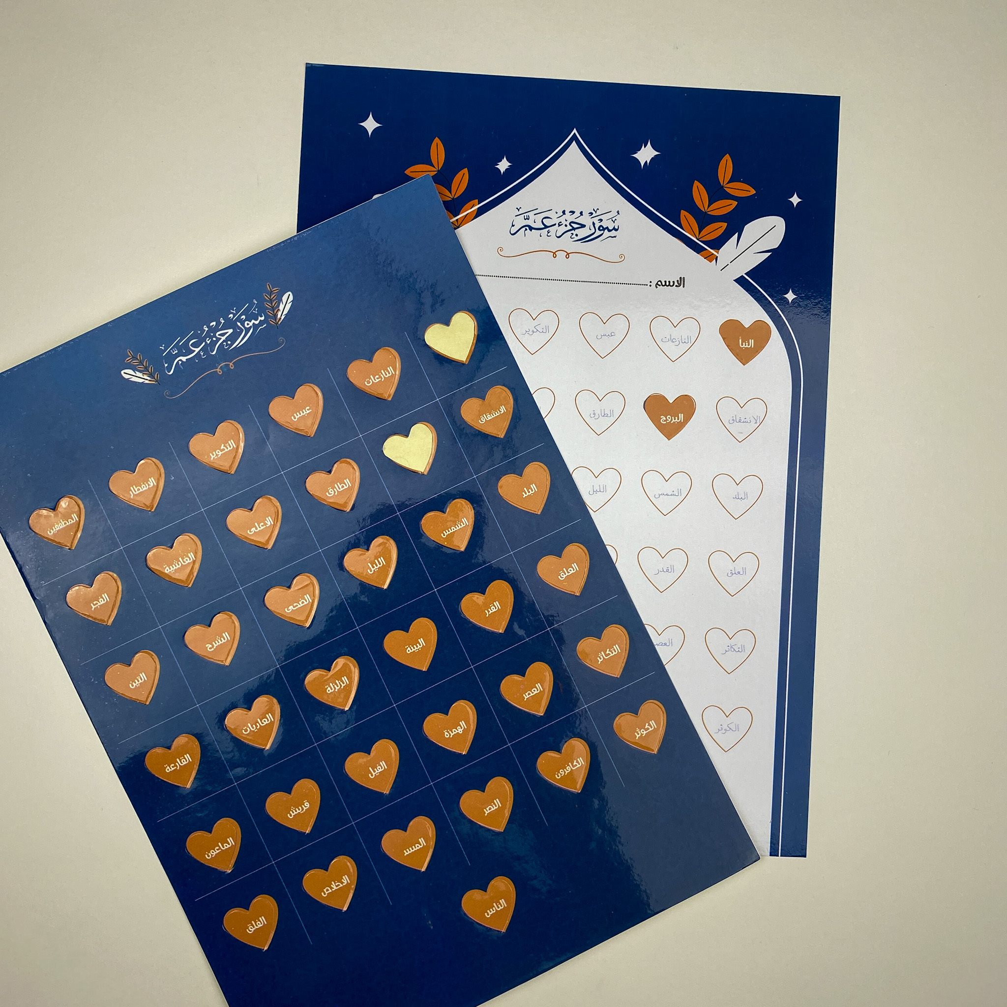 Stickers sheet to enthuse kids for Hefz, Telawah and Revision, contains the name of Surah with Heart-shaped.