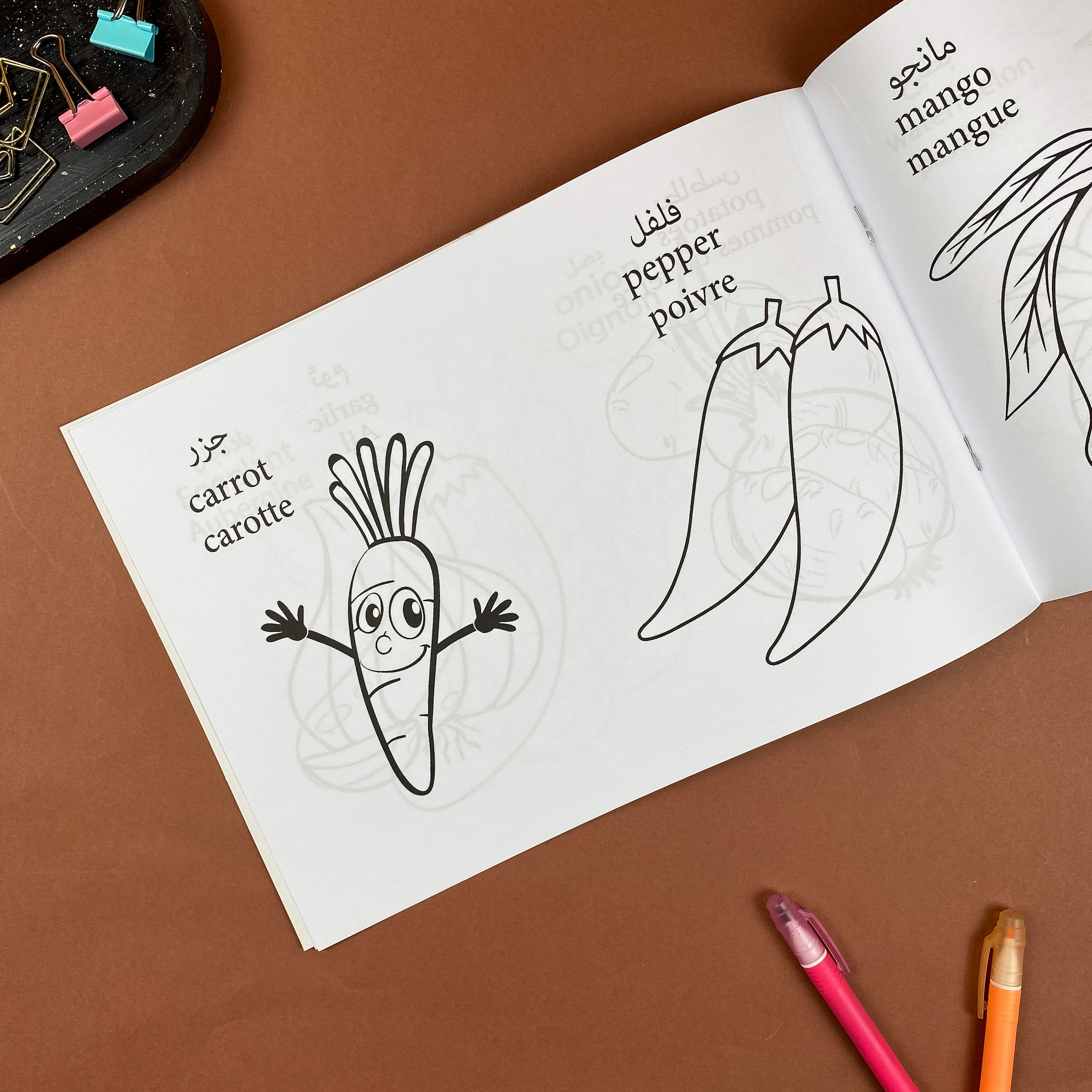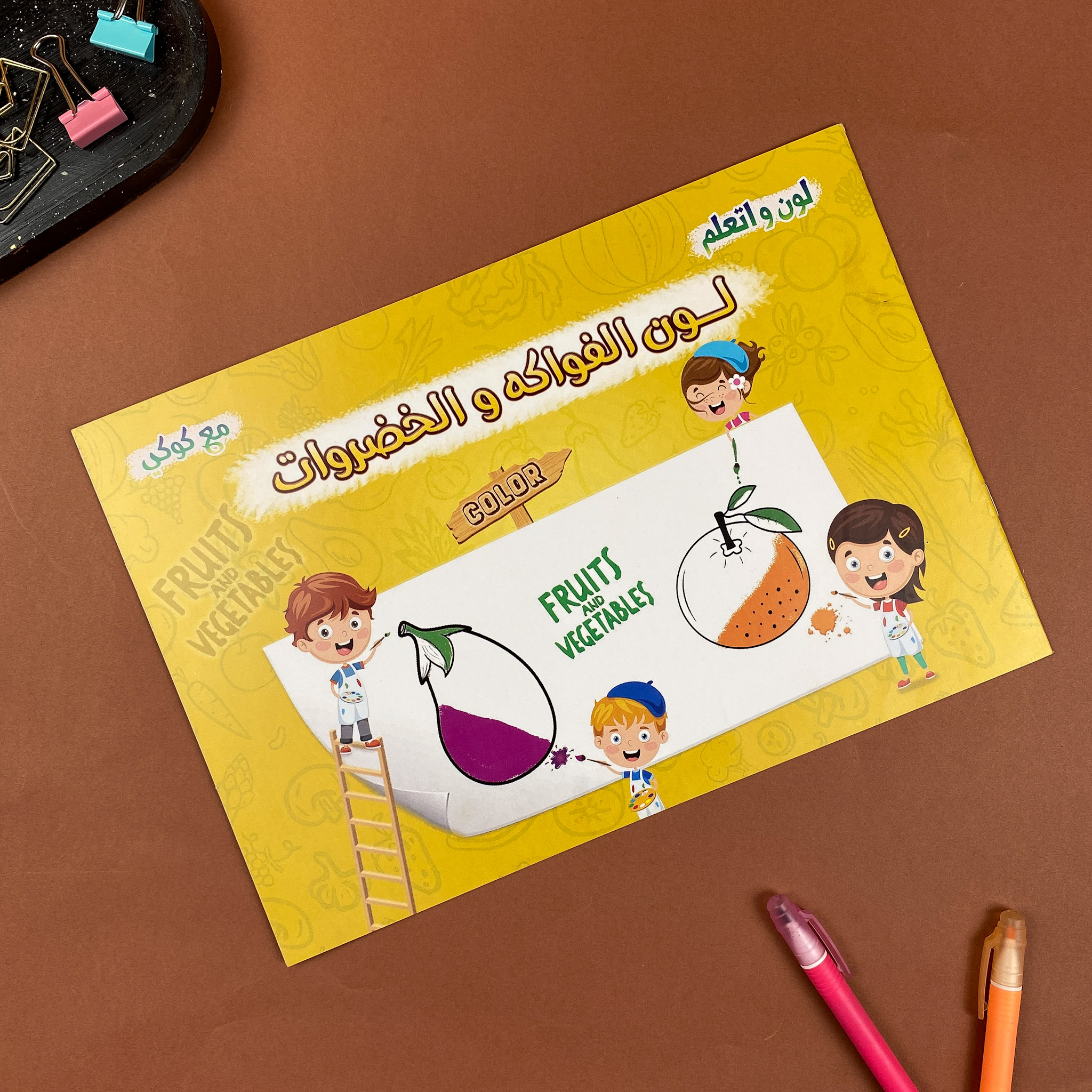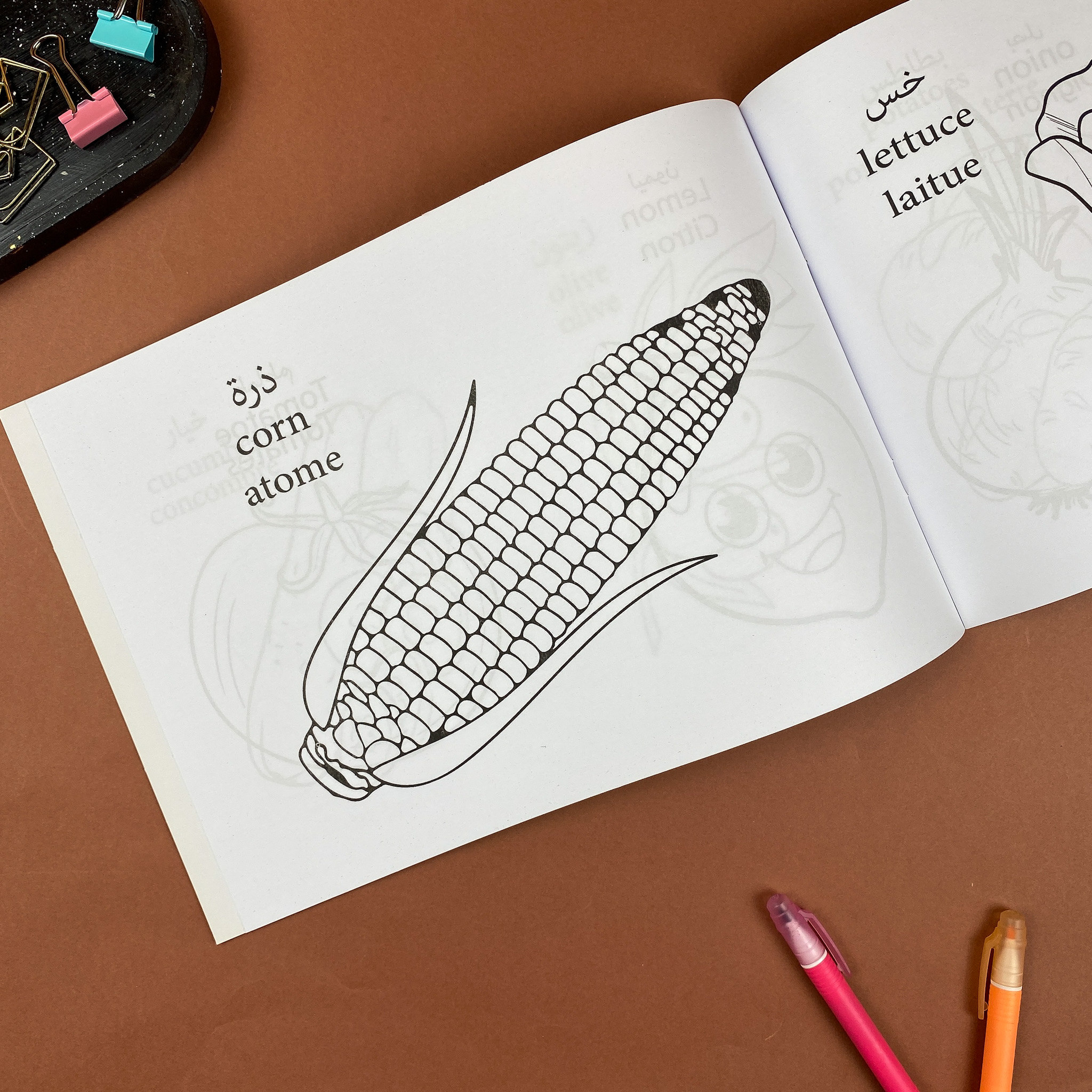 A simple coloring book that helps kids explore different fruits and vegetables in a fun way.